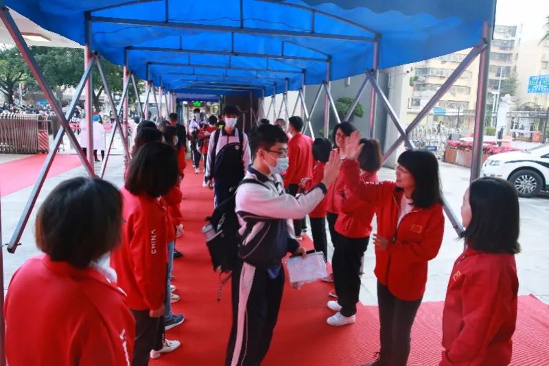 5日上午七点半,深圳市龙岗区第二职业技术学校校长王世豪带领全体行政班子、2019级高考班全体老师出现在送考走廊,用一声声响亮地击掌,把最美好的祝愿送给自信迈向考场的高三学子们。