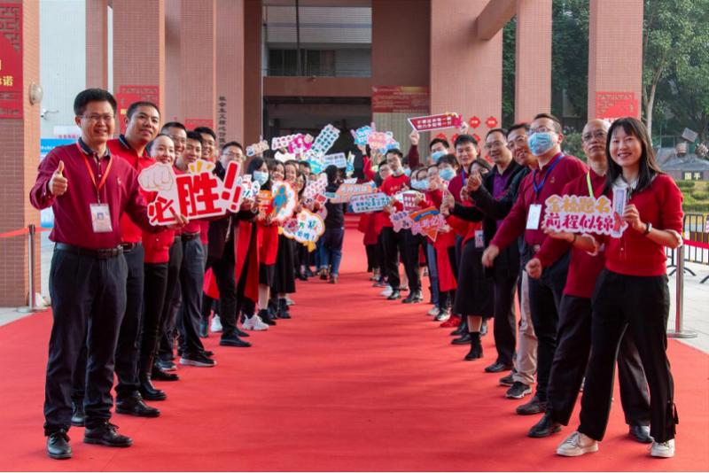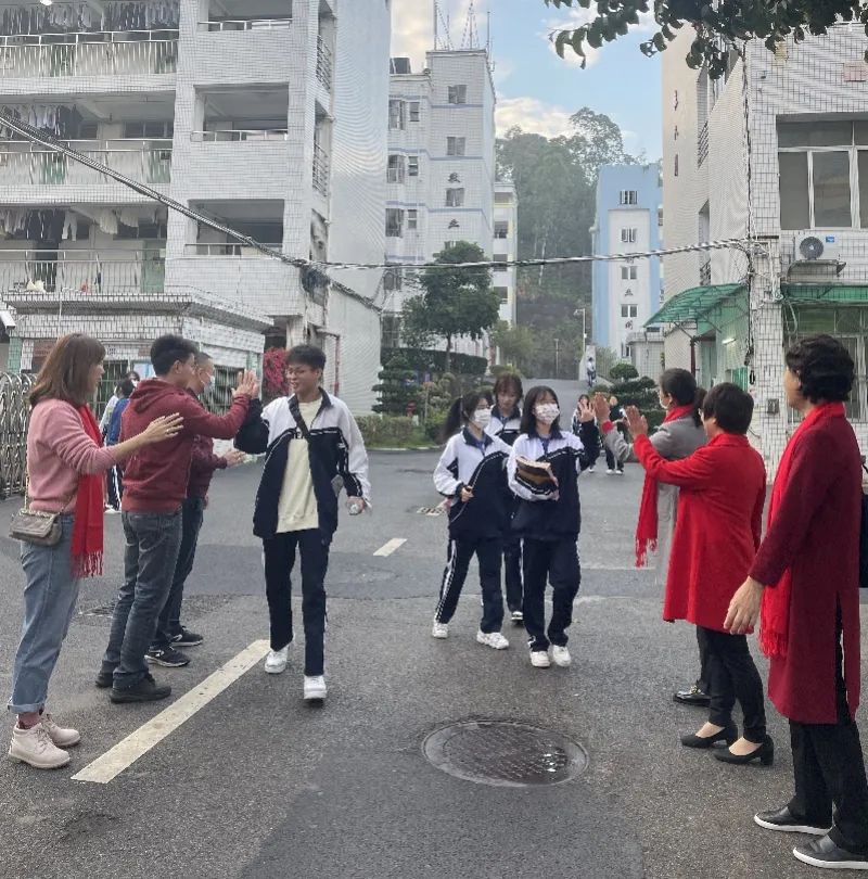 高考期间,该校安排接驳车到地铁口接送考生,为每一个专业部开展考前心理辅导;还邀请营养专家提供菜谱,由学校食堂为考生提供三天的高考期间“爱心高考必胜套餐”免费餐。在5日开考当天,深圳二职校领导和带考老师们,统一穿着红色送考服,为考生们开展“走红地毯,送行礼”活动,与考生击掌送行,为他们加油助力。