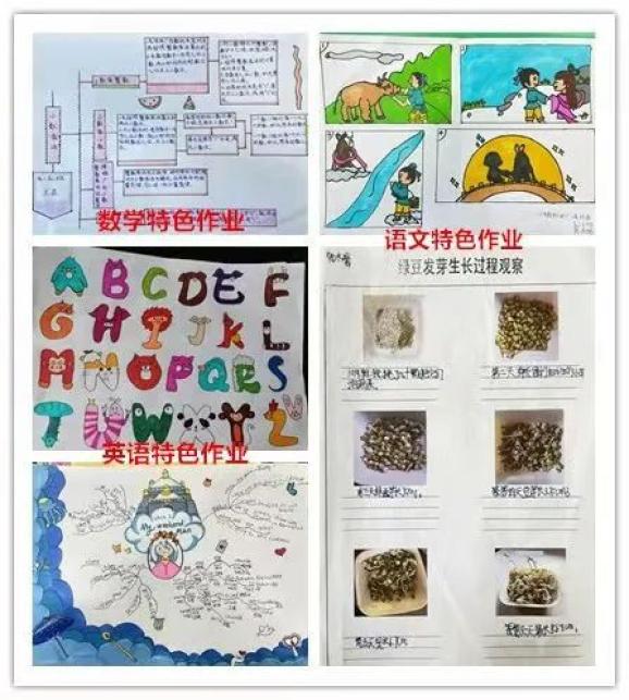 特色作业:特色作业的设计体现趣味性、思维性、综合性、创造性,以激发兴趣、提升综合能力和素养为主要目的。语文学科根据学习内容设计听、说、读、背、阅读等类型的综合性、实践型作业,如生活识字、活动体验、美文积累、文集创编、观察日记、识字扑克牌等,探索将书面作业和体验、实践型作业相结合,激发学生兴趣;数学学科根据学习需求设计调研观察、动手实践类作业,如观察记录、生活实验、数字卡片游戏、数学阅读、思维导图等,拓展学生的思维;英语学科注重书面作业与听、说、读、背实践作业的整合,设计字母卡片、思维导图、英语小报等,提升学生综合运用能力。