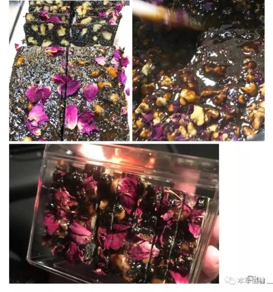 做法:先将阿胶浸泡在黄酒中两天,倒入锅内,用文火融化,倒入冰糖,改用小火慢炖至膏体呈挂起状,倒入核桃拌匀,均匀撒入芝麻,撒入玫瑰。倒入不粘锅的容器内,放置一天后切片。每日服用一片。