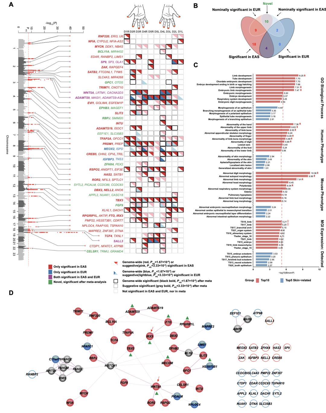 为了更全面地了解指纹模式的遗传结构,团队还寻找了美国、英国、澳大利亚的多家合作伙伴,对全球范围内已有的东亚血统队列和欧洲血统队列,超过23,000个个体进行大规模荟萃分析,分析了几百万个遗传点位,识别出43个与人类指纹花纹相关的遗传基因座,105个显著基因。