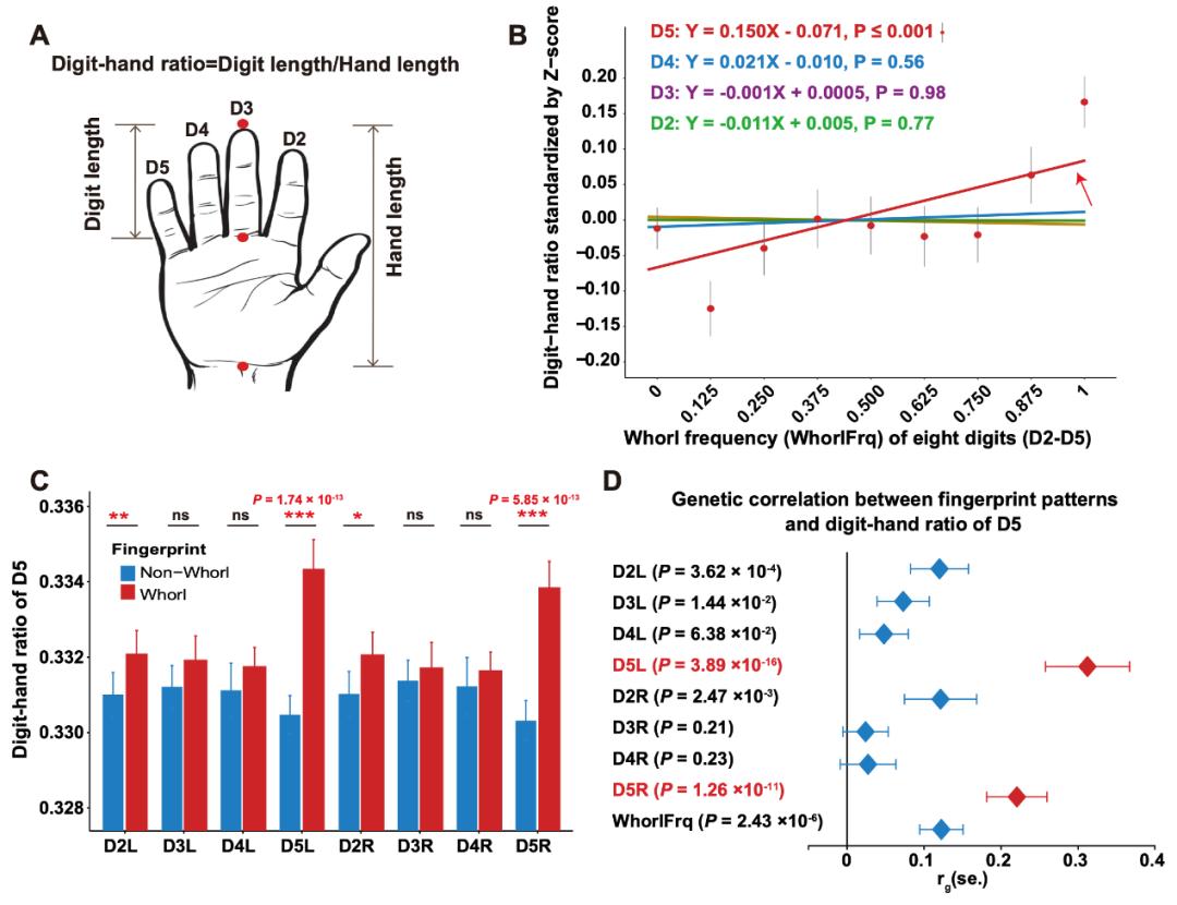 为进一步验证胚胎和胎儿肢体发育可能影响指纹花纹类型的假设,团队又检测了指纹模式与肢体相关表型(即手表型)之间的相关性,发现指纹花纹与手指长度比例之间广泛相关,并具有共同遗传基础。比如,小指相对越长,掌长相对越短,双手斗型花纹越多;而食指远端指节(指纹形成处)相对越长,斗形花纹则越少。