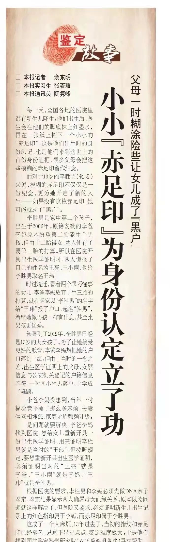 而对于13岁的李胜男(化名)来说,模糊的赤足印不仅仅是一份纪念,更为她开启了新的人生——如果没有这枚赤足印,她可能就成了“黑户”。