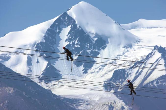 国家电网公司建设的青藏联网工程。图为施工人员“行走”在“昆仑之巅”。