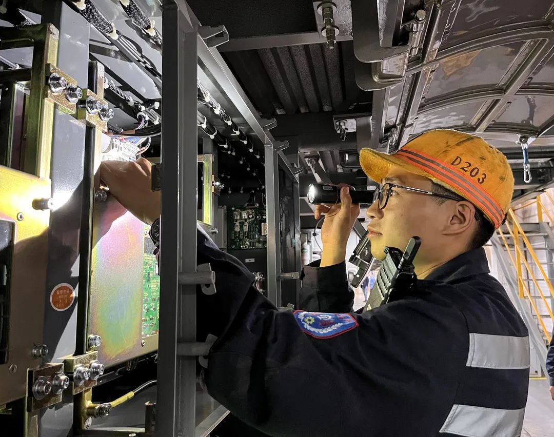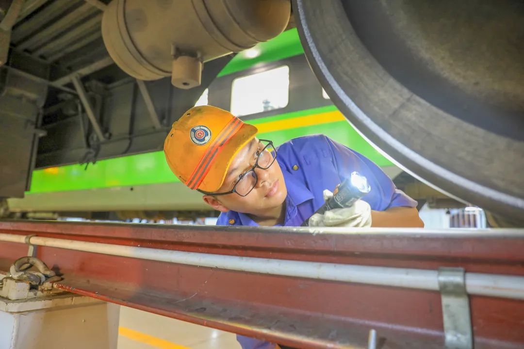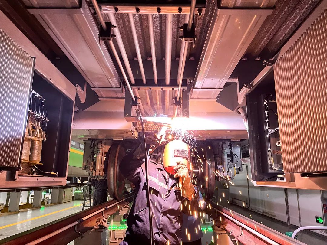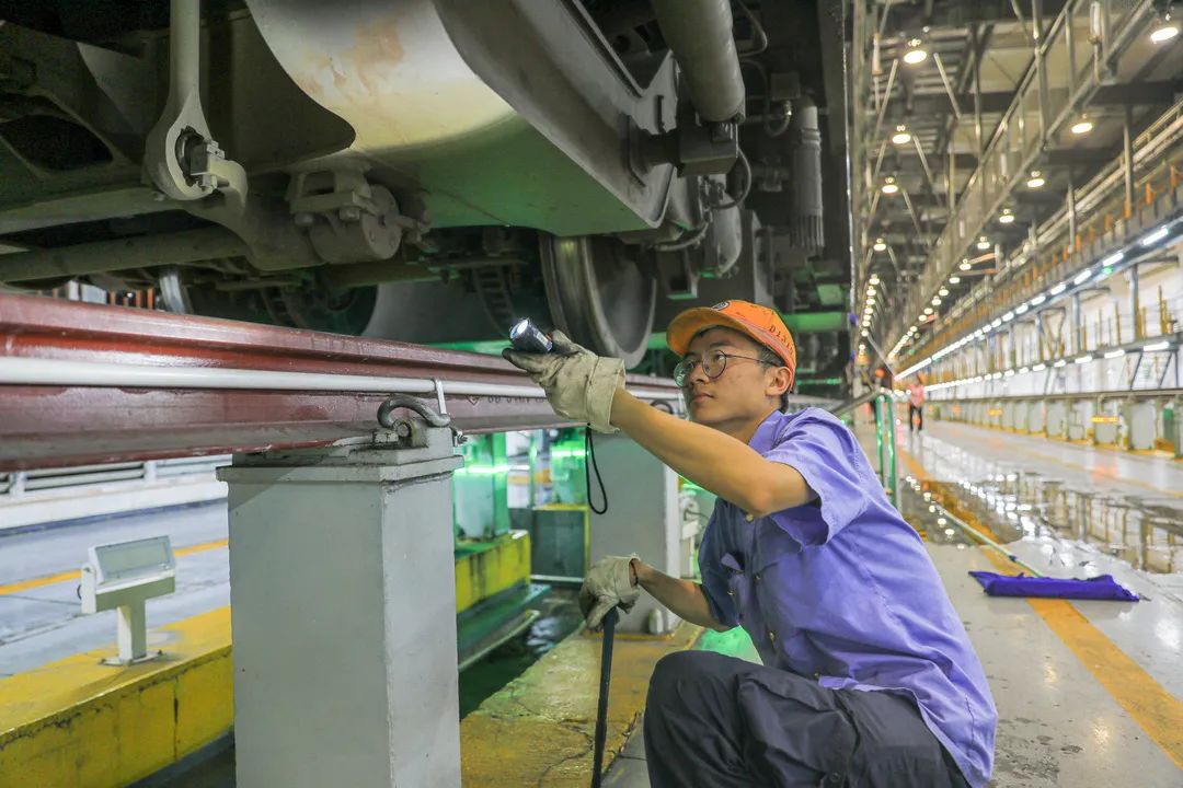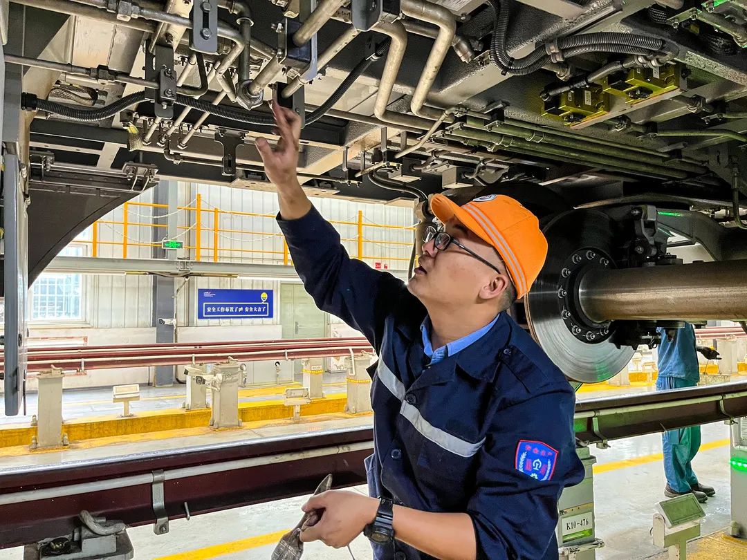 每天,地面作业人员对入库动车各设备装置进行“全面体检”,确保车辆检修质量,满足乘客对美好出行体验的需求。