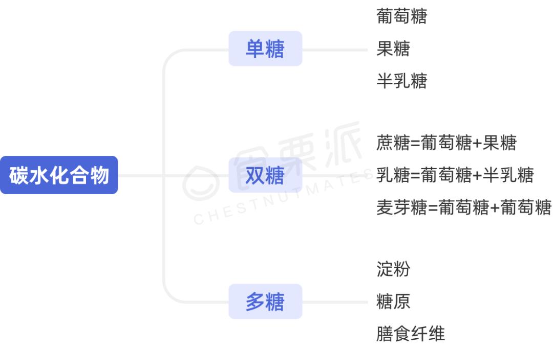 淀粉是植物储存葡萄糖的形式,谷类、豆类,薯类,以及根茎类蔬菜(南瓜、胡萝卜、藕)都富含淀粉;糖原是动物(包括人)储存葡萄糖的形式,主要储存在肝脏和肌肉中,是重要的储备能源;膳食纤维是无法被人体完全消化的一类碳水化合物。