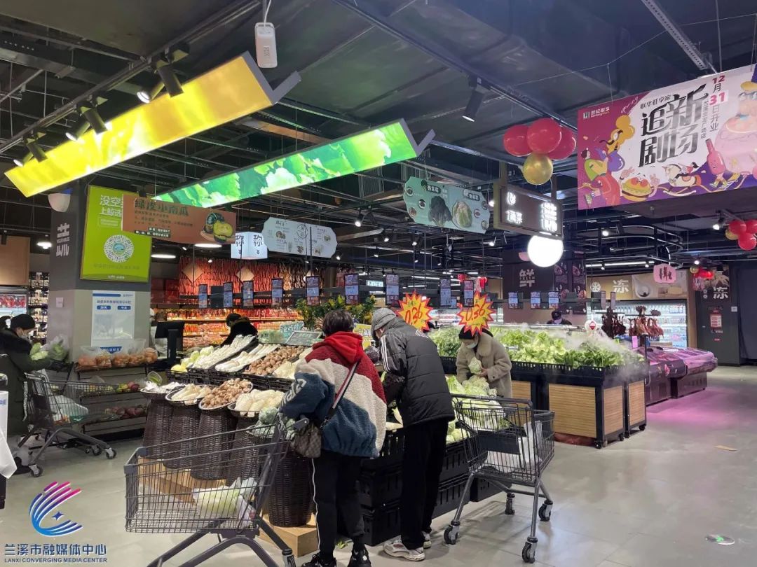 在世纪联华兰溪宝龙店,记者看见超市入口处设立了人脸测温监控管理系统,市民排队测温、亮码,有序进入超市购物。