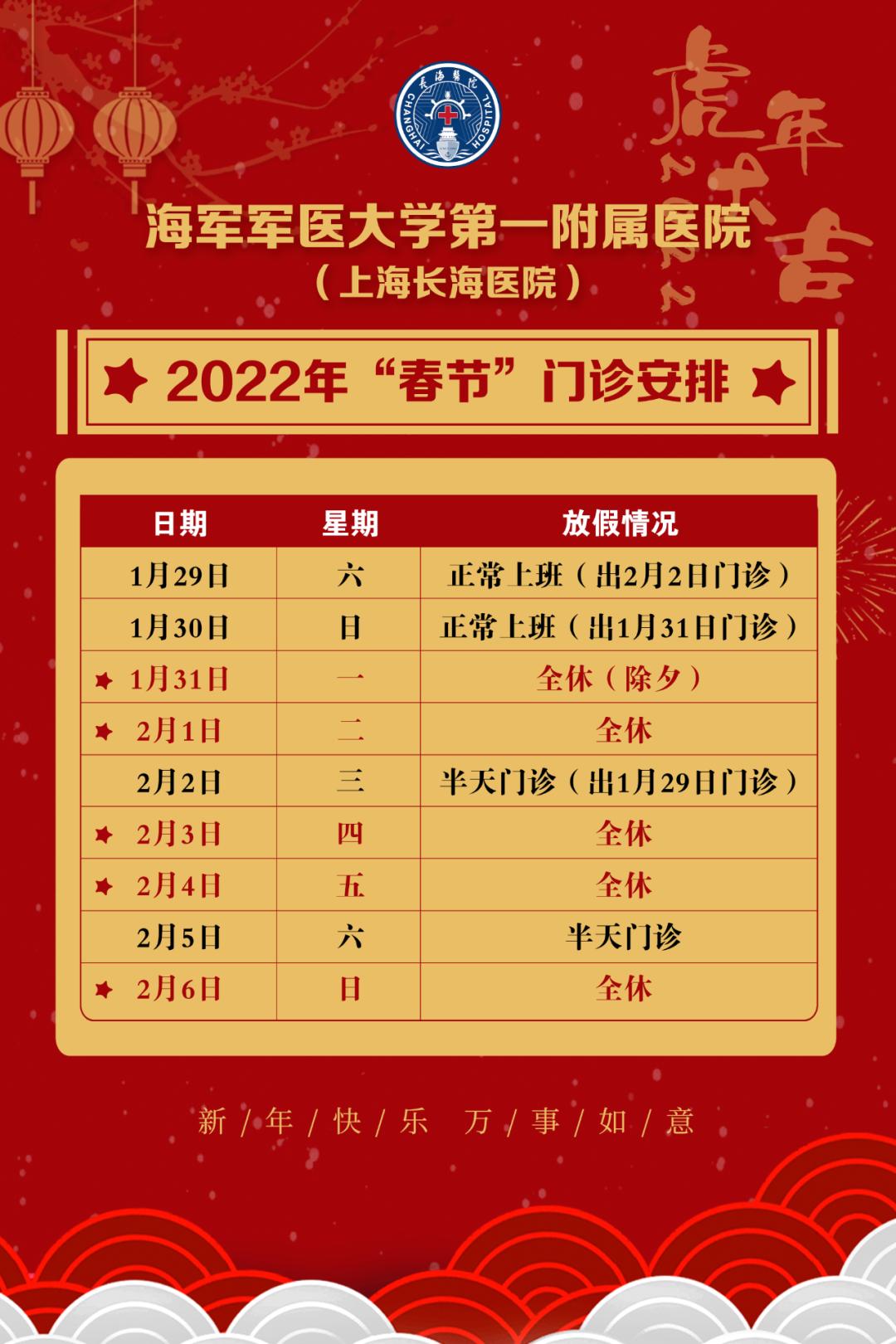 根据国务院办公厅通知,2022年春节放假时间为1月31日(星期一)至2月6日(星期日),共7天。为满足患者就诊需求,同时确保医务人员合理休假,医院门诊工作时间安排如下: