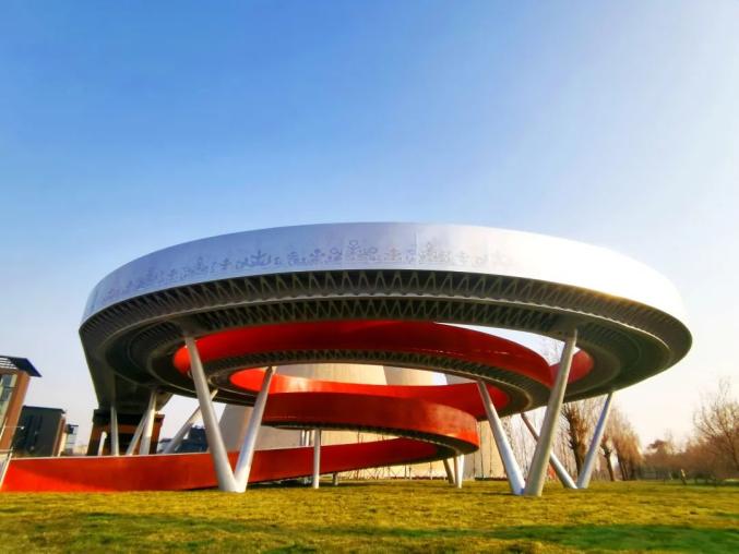 “冬奥之环”位于首钢滑雪大跳台西北侧,是冬奥公园标志性景观节点之一。“冬奥之环”沿用北京冬奥会会徽“冬梦”设计,顶部的银色环形钢圈科技感十足,中间的红色阶梯如丝带般环绕而下,绘就艺术字体的“冬”字式样,完美诠释“纯洁的冰雪,激情的约会”美好愿景,外侧还点缀着片片雪花,冰雪氛围十足。