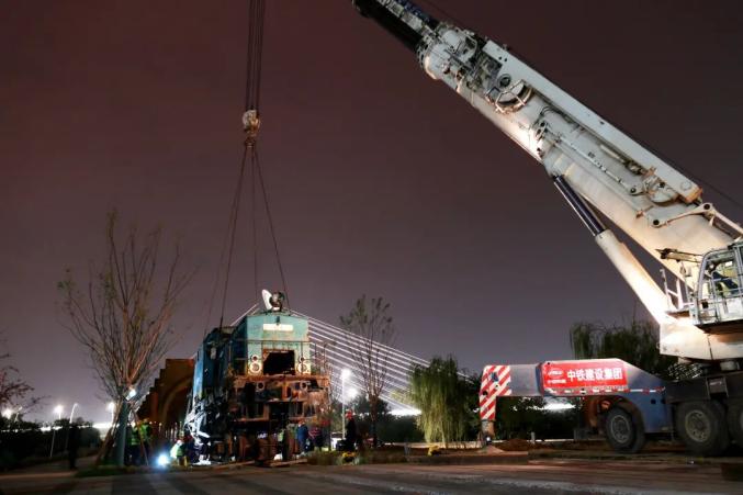 夜幕下的火车头吊装