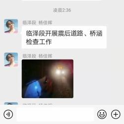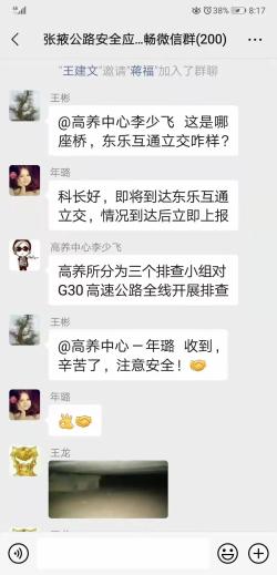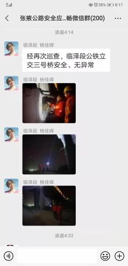凌晨2:36分,张掖公路安全应急保畅微信群不断传来了工作信息,开始异常忙碌起来,一条条消息不时地跃然手机屏幕上,每一条消息的分量都很足……