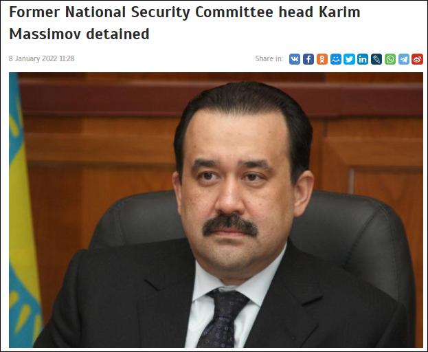 据哈萨克国际通讯社1月8日援引哈萨克斯坦国家安全委员会通报称,哈萨克斯坦前总理、前国家安全委员会主席马西莫夫因涉嫌叛国罪被捕。
