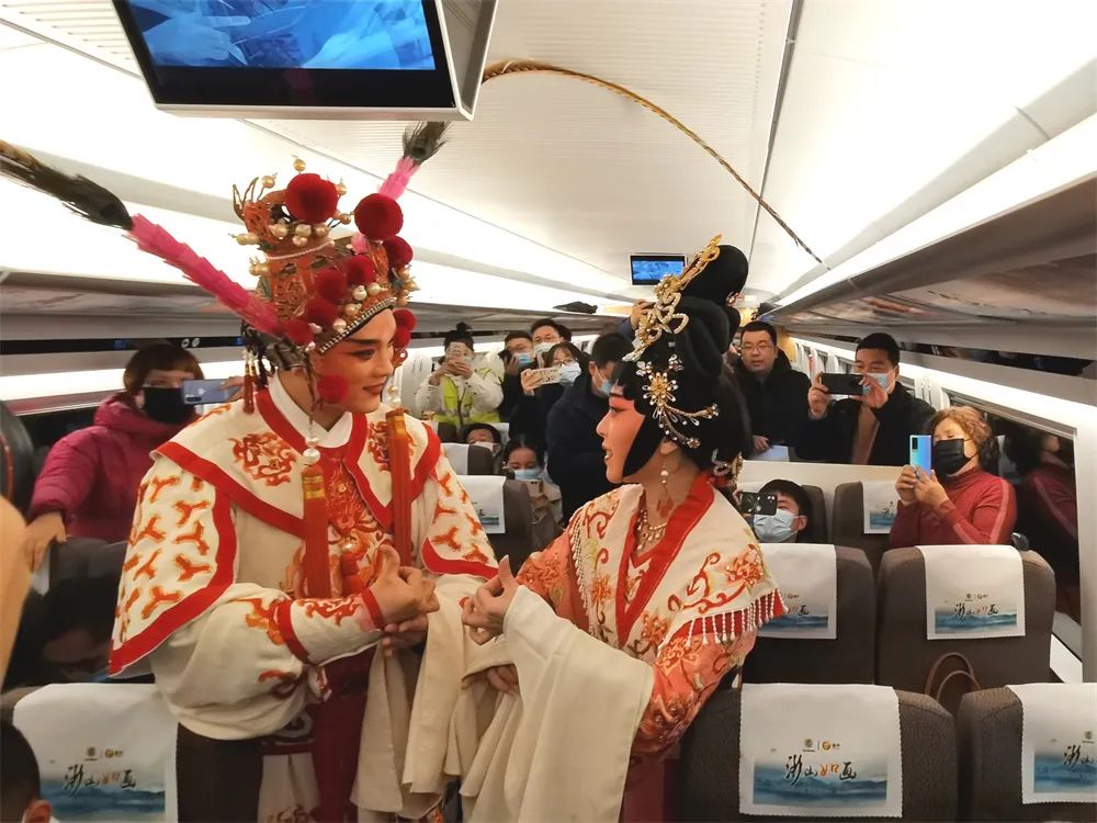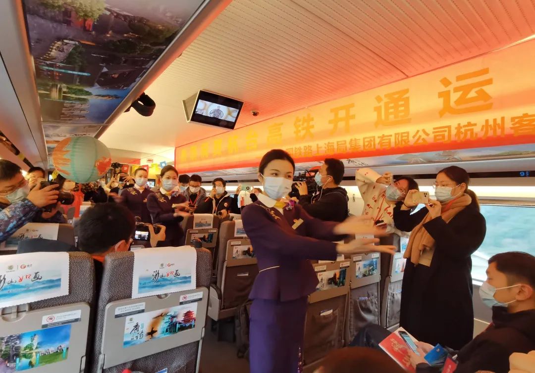 乘坐首发列车的天台县委书记杨玲玲说:“飞腾直欲天台去,只要一张高铁票。春节前凭高铁票,可半价游天台山所有景区!”