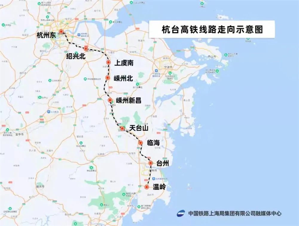 杭台高铁线路全长266公里,设计时速350公里,设绍兴北、上虞南、嵊州北、嵊州新昌、天台山、临海、台州、温岭8个车站。