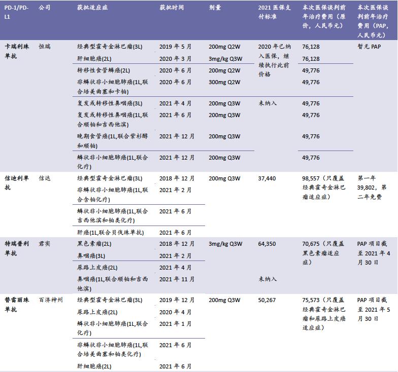 截至目前,包括替雷利珠单抗在内,国内已有11款PD-1/PD-L1抑制剂获批上市(7款国产和4款进口),并且君实生物(688180.SH,01877.HK)、信达生物(01801.HK)、恒瑞医药(600276.SH)、百济神州4家的国产PD-1均已降价进入医保。在2021年末的医保谈判中,医保适应症还有进一步扩容。