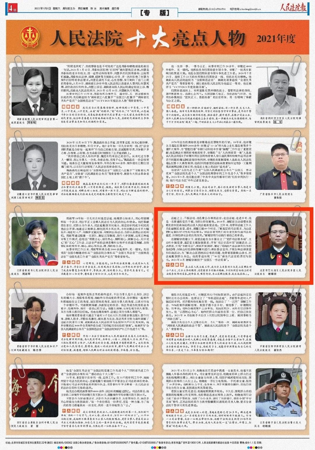 1月8日,《人民法院报》整版刊发2021年度人民法院十大亮点人物,重温一年中法院系统涌现出的先进典型,将榜样的力量发扬光大。