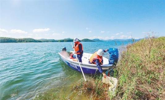 水库生态巡查队队员在清理水域垃圾。