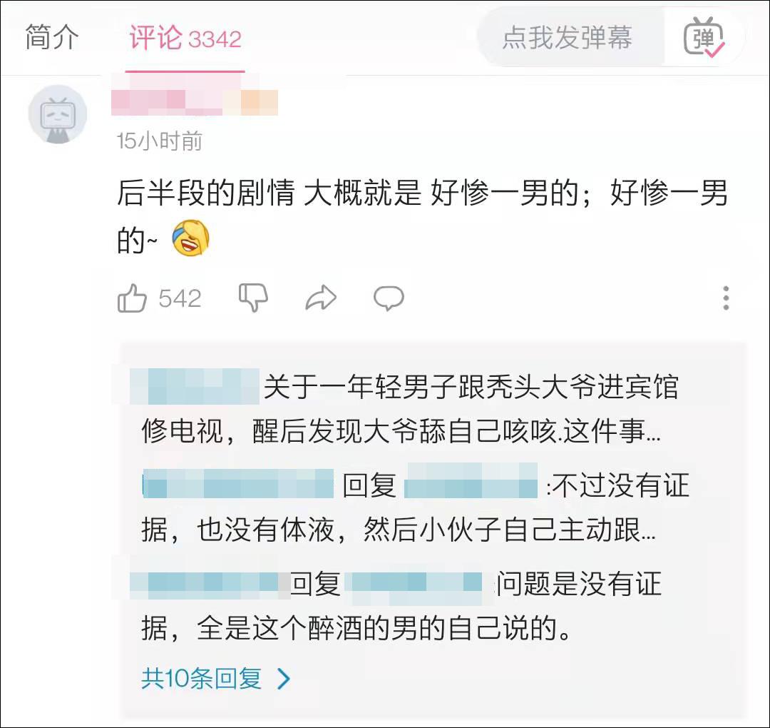 醉酒男一边骂骂咧咧,“你看咯,他都知道我袜子在哪里”,一边接过穿好衣服,临出门还狠狠盯了秃头中年男一眼。