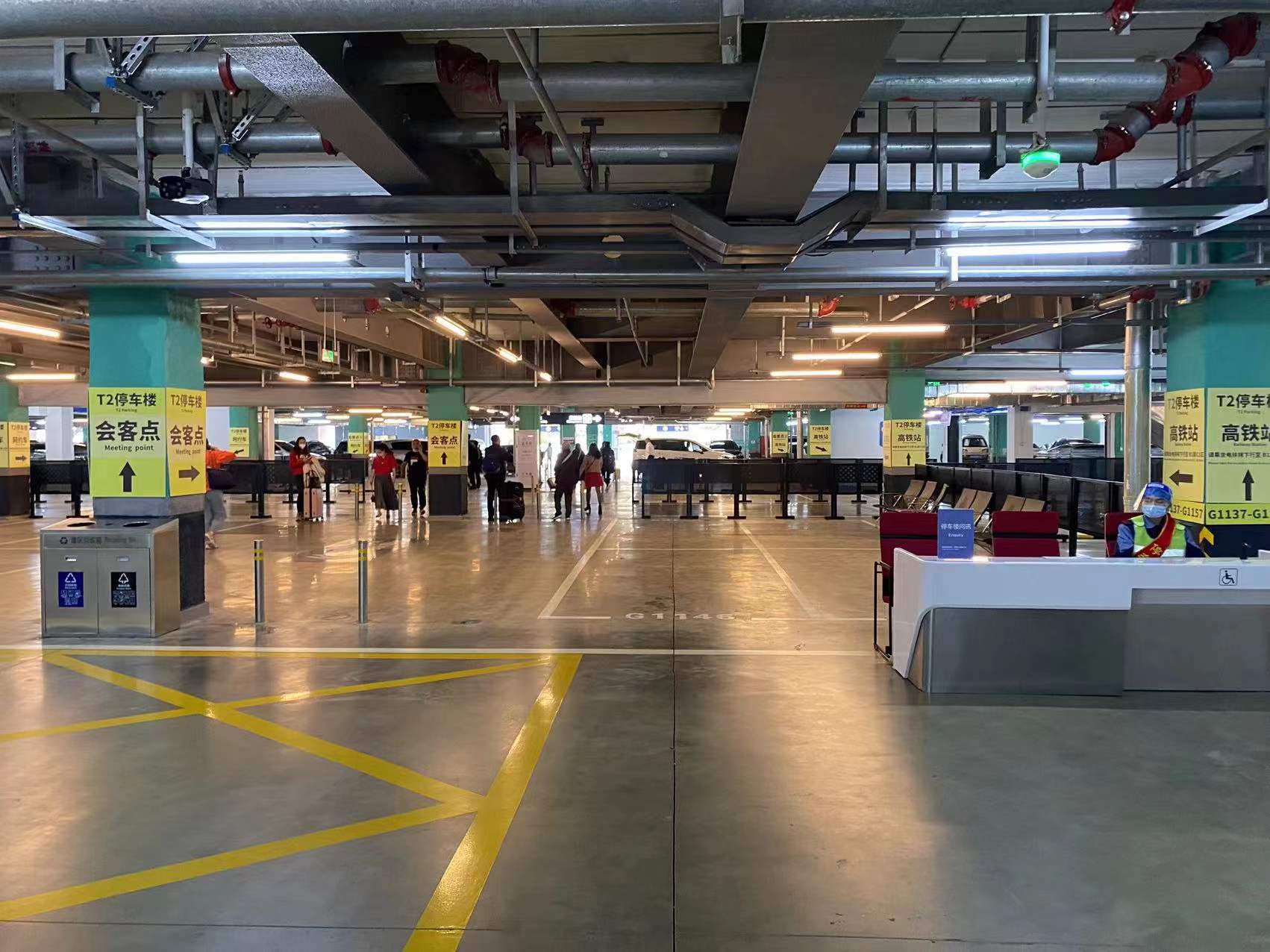 T2停车楼整体由A、B、C、D四个子停车楼及地下车库组成,配备无障碍车位、24小时视频监控、车辆自动识别、无感支付、自助寻车、新能源充电桩、线上寻车小程序、网约车专属候车区等基础设施。为给旅客提供更好的候车环境,美兰机场在T2停车楼1层C1区域,设置停车楼问询处为过往旅客解答疑惑,指引目的地。同时,为了便于司机及乘客可以互相快速找到所在位置,特在该区域设置会客点,配套等候座椅、人员指引等服务,极大缩短司机与乘客互相寻找时间。