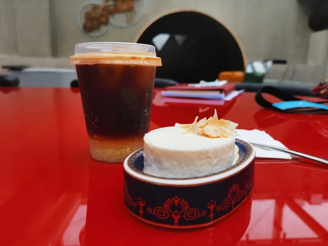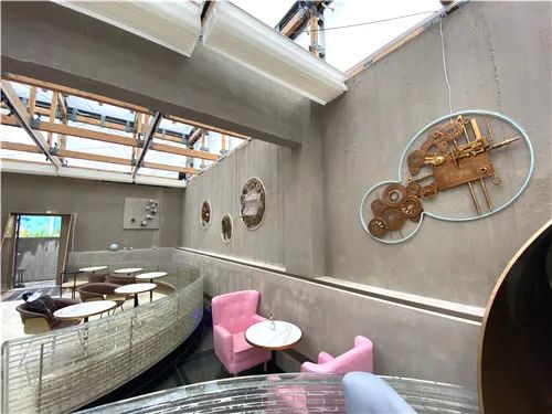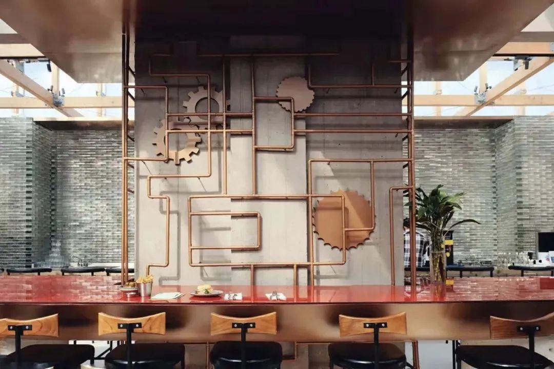 色彩简约、设计硬朗的白七咖啡馆里弥漫着皂香、咖啡香。玫瑰红色的吧台,简约木凳和黑金色蒸汽管道搭配在一起,充满浓郁的工业风气息。吧台和墙壁上的圆形金属装饰,是用制皂设备零部件制成的。为周围萦绕的咖啡香增添了不少年代感。