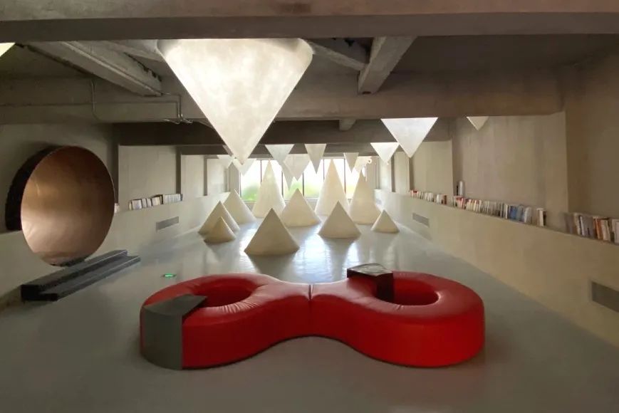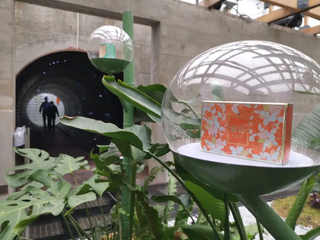 从咖啡馆沿圆柱形通道往里走,就会进入一个奇异的“小世界”,这里以前是制皂厂排污区,如今变成肥皂展览馆。不同年代、包装形态各异的肥皂被放在一个个肥皂泡形的透明展示窗内,犹如“长”在绿色植物中。