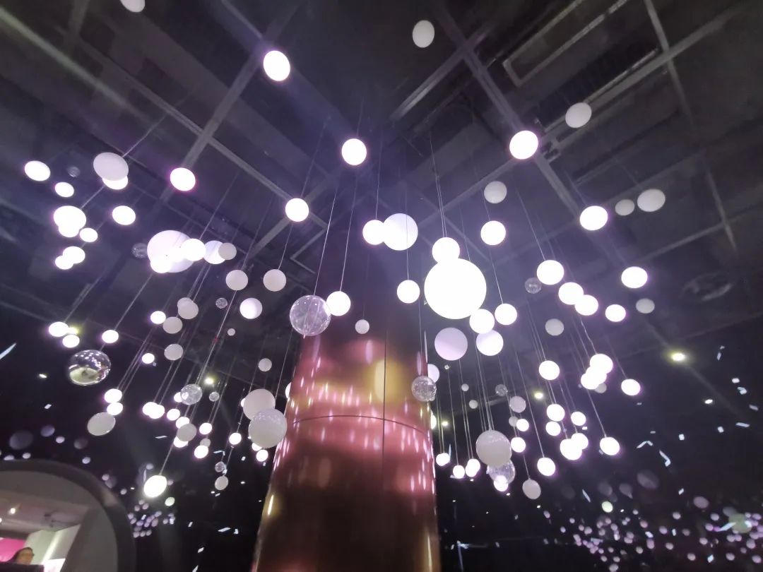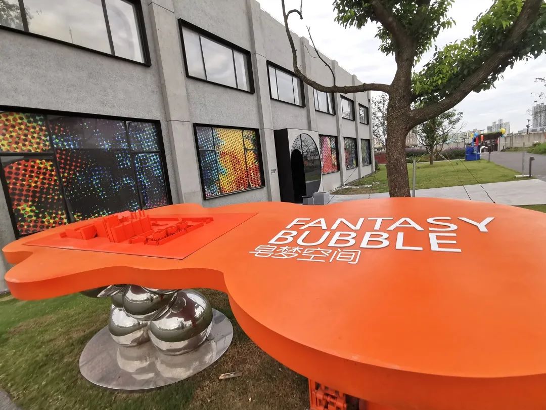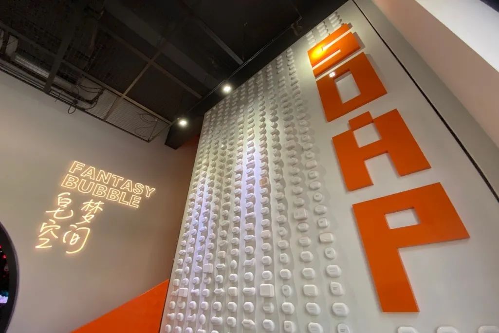 往深处探索,进入“皂梦空间”展示体验馆能注意到视觉艺术装置——“源泉”。游客可以通过装置在四周管道进行吹泡泡互动,带有芬芳气味的泡泡在四周棱镜的反射下,构成光怪陆离的泡泡世界。