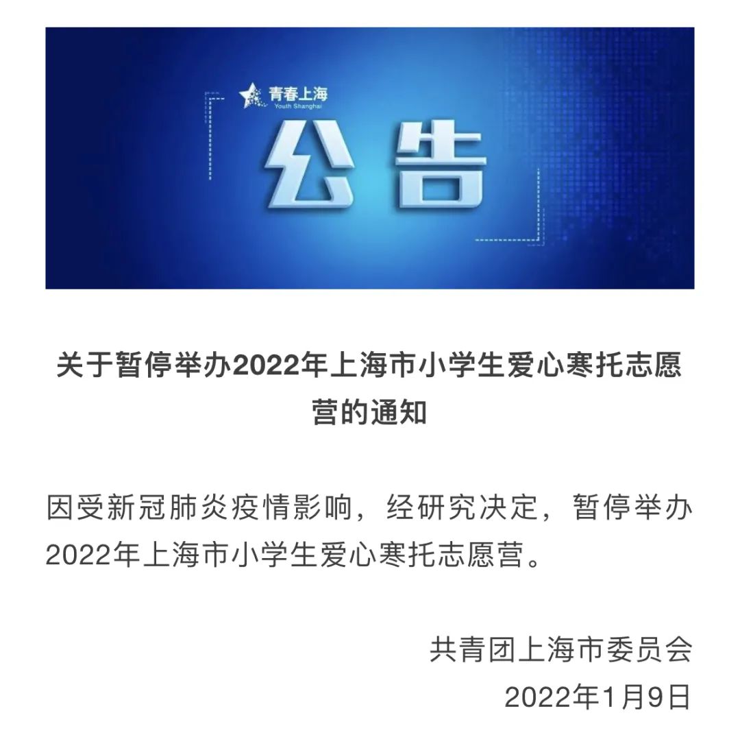 今天(1月9日)下午,共青团上海市委员会发布《关于暂停举办2022年上海市小学生爱心寒托志愿营的通知》。详↓