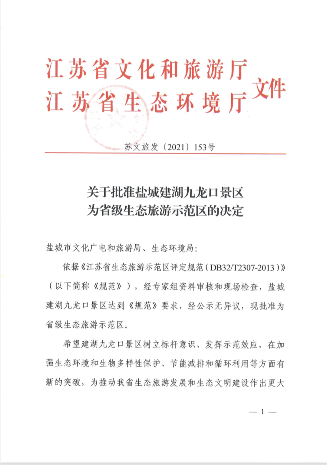 此前,江苏省文化和旅游厅联合江苏省生态环境厅发文,正式批准盐城建湖九龙口景区为省级生态旅游示范区。