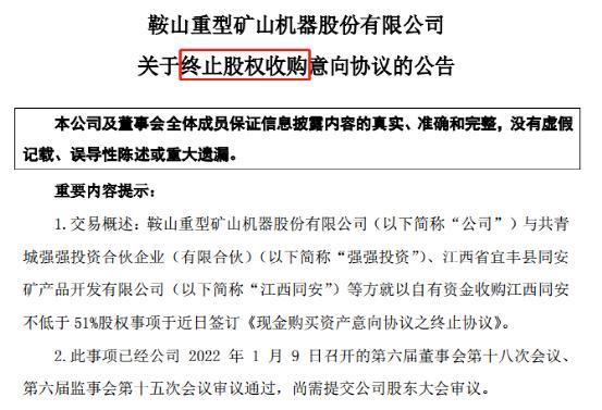 根据公告,鞍重股份称,与强强投资、江西同安等方就以自有资金收购江西同安不低于51%股权事项于近日签订《现金购买资产意向协议之终止协议》。