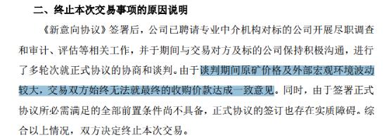公司给出的理由是,去年8月《新意向协议》签署后,公司已聘请专业中介机构对标的公司开展尽职调查和审计、评估等相关工作,并于期间与交易对方及标的公司保持积极沟通,进行了多轮次就正式协议的协商和谈判。由于“谈判期间原矿价格及外部宏观环境波动较大,交易双方始终无法就最终的收购价款达成一致意见”。
