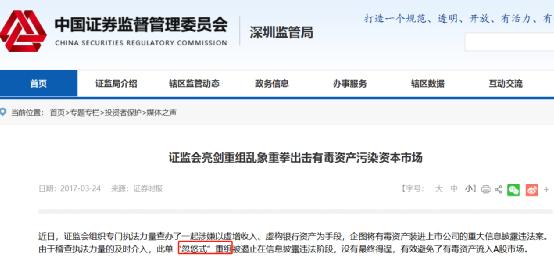 2017年3月10日,证监会官方发布《证监会亮剑重组乱象重拳出击有毒资产污染资本市场》一文,称近日查办了一起涉嫌以虚增收入、虚构银行资产为手段,企图将有毒资产装进上市公司的重大信息披露违法案。