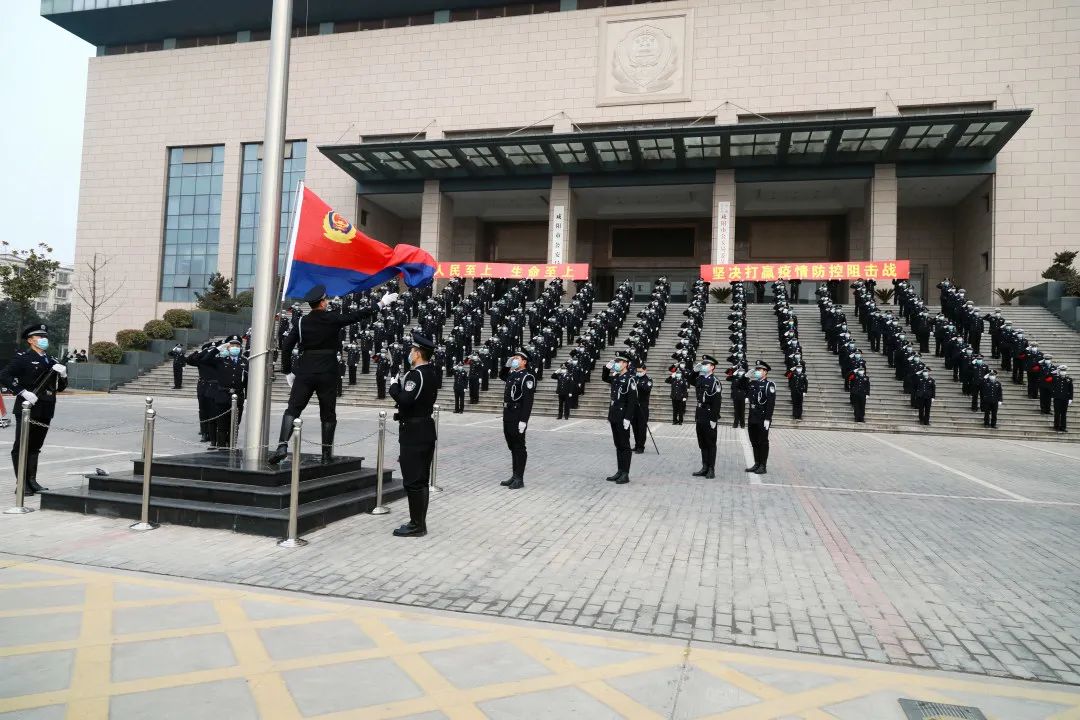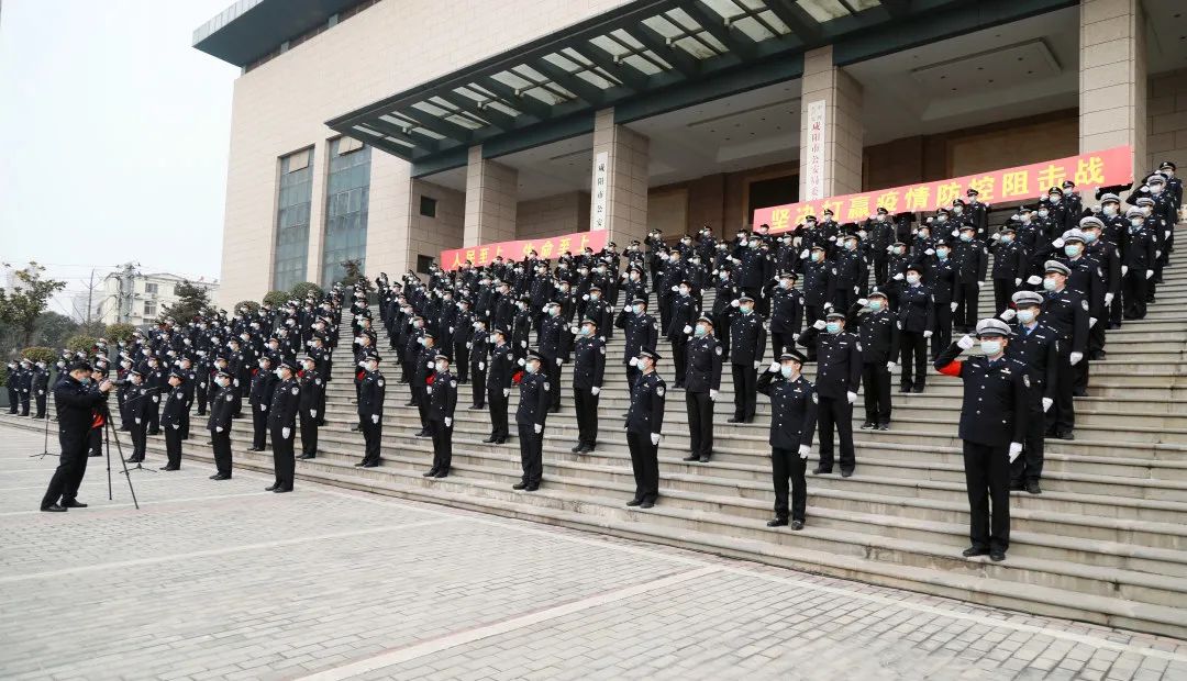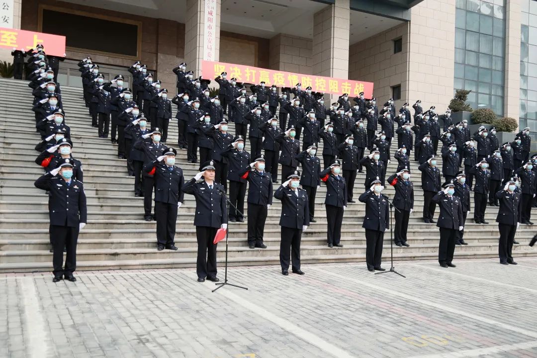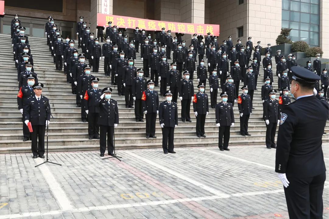 副市长、市公安局党委书记、局长陈万峰,在家局领导班子成员,局机关200余名民警代表精神抖擞,整齐列队。“人民至上、生命至上,坚决打赢疫情防控阻击战”19个大字分列两侧。