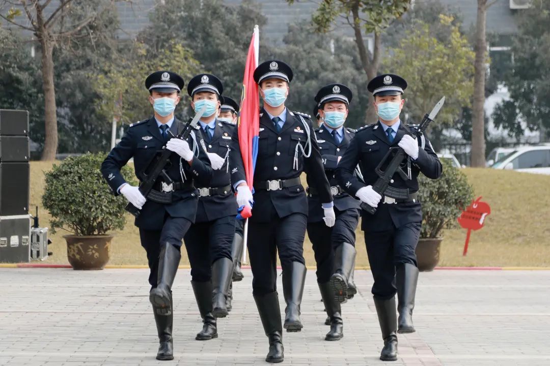 9时整,仪仗队英姿挺拔、步伐铿锵,护卫着警旗正步行进至升旗台,随着护旗手振臂一挥,红蓝相间的警旗冉冉升起,全体民警心潮澎湃、庄严敬礼,高唱《中国人民警察警歌》。