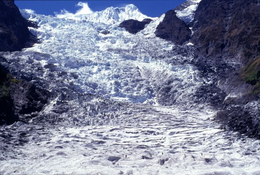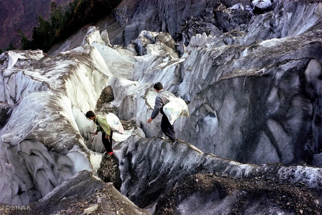 下图:背着回收的遗物,在不稳定的冰川上行走。