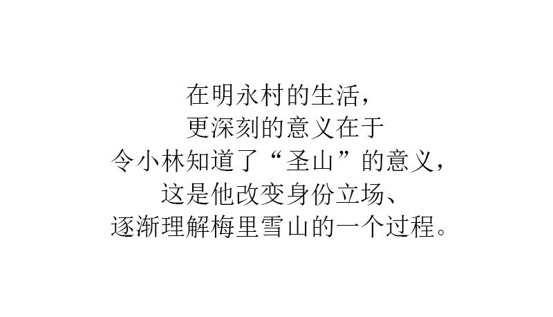 只有生活在一起,才能真正理解。在明永村的生活,更深刻的意义在于令小林知道了“圣山”的意义,这是他改变身份立场、逐渐理解梅里雪山的一个过程。“起初我是登山者,只会望着顶峰,一心只想到达最高点。然后我成为搜索者,第一次感受到山的可怕之处,可以吞噬人的性命。最后我成为了生活者,对梅里雪山是圣山这件事有了实感,以前从山上往山下看,我总觉得明永村是一个贫乏的村子,实际住在其中之后,才了解到这是一个得到那么多自然恩惠的地方,有那么多农作物和水果,其实是很丰裕的。”