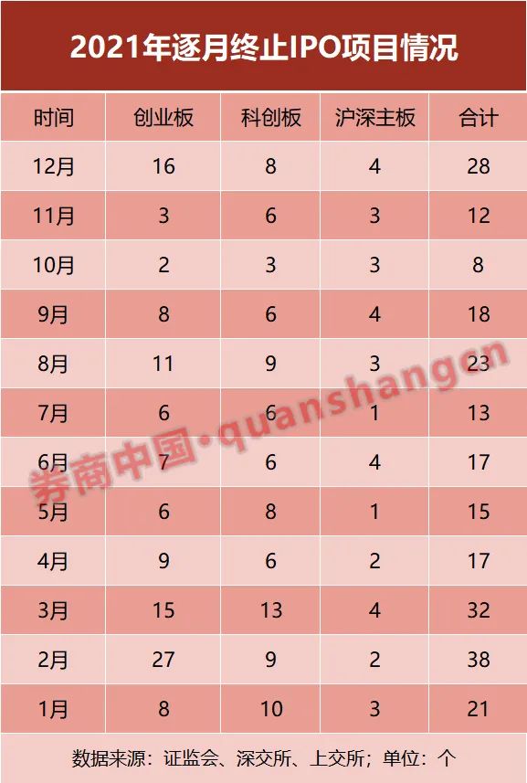 从往年数据来看,12月终止家数同样处高位水平,2020年12月仅是科创板与创业板IPO终止家数合计就有29家。