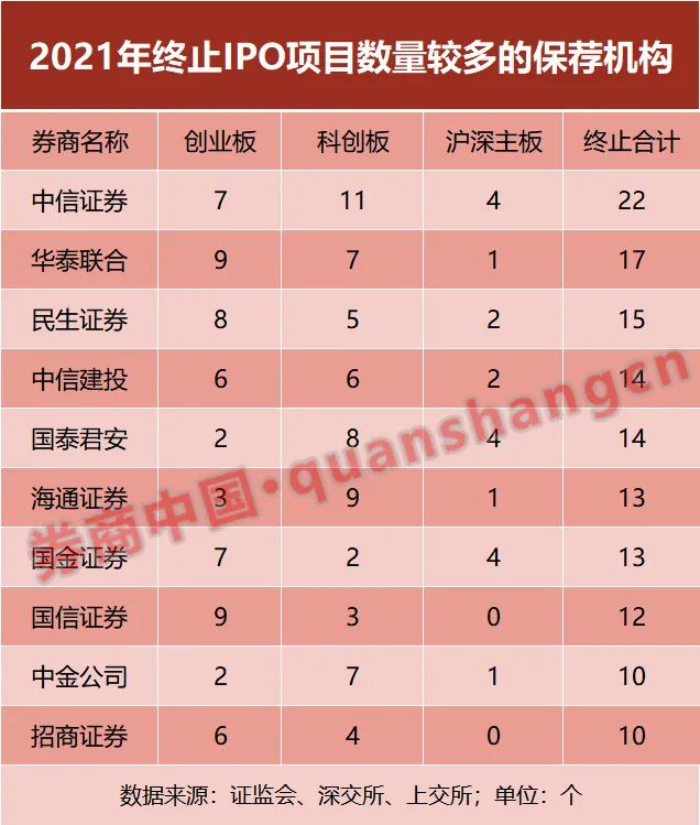 根据券商中国记者统计,2021年中信证券终止的IPO项目数量最多,共有22家,其中科创板有11家。