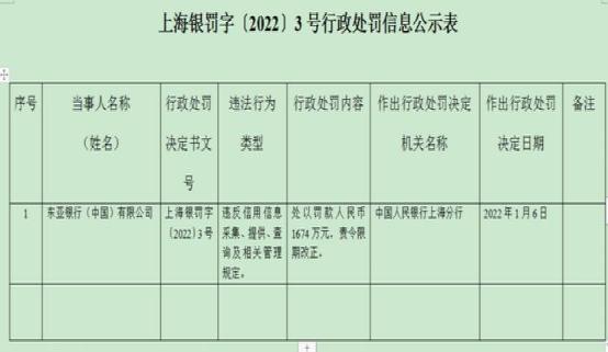 罚单显示,东亚银行主要违法违规事实(案由)为违反信用信息采集、提供、查询及相关管理规定。对于上述违法违规行为,中国人民银行上海分行对东亚银行处以罚款人民币1674万元,责令限期改正。