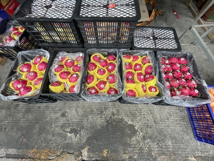 市场里从事国产火龙果批发的摊位又是另外一番景象,约1600箱火龙果整齐地码放在货车里,各种不同规格的火龙果正在热销。