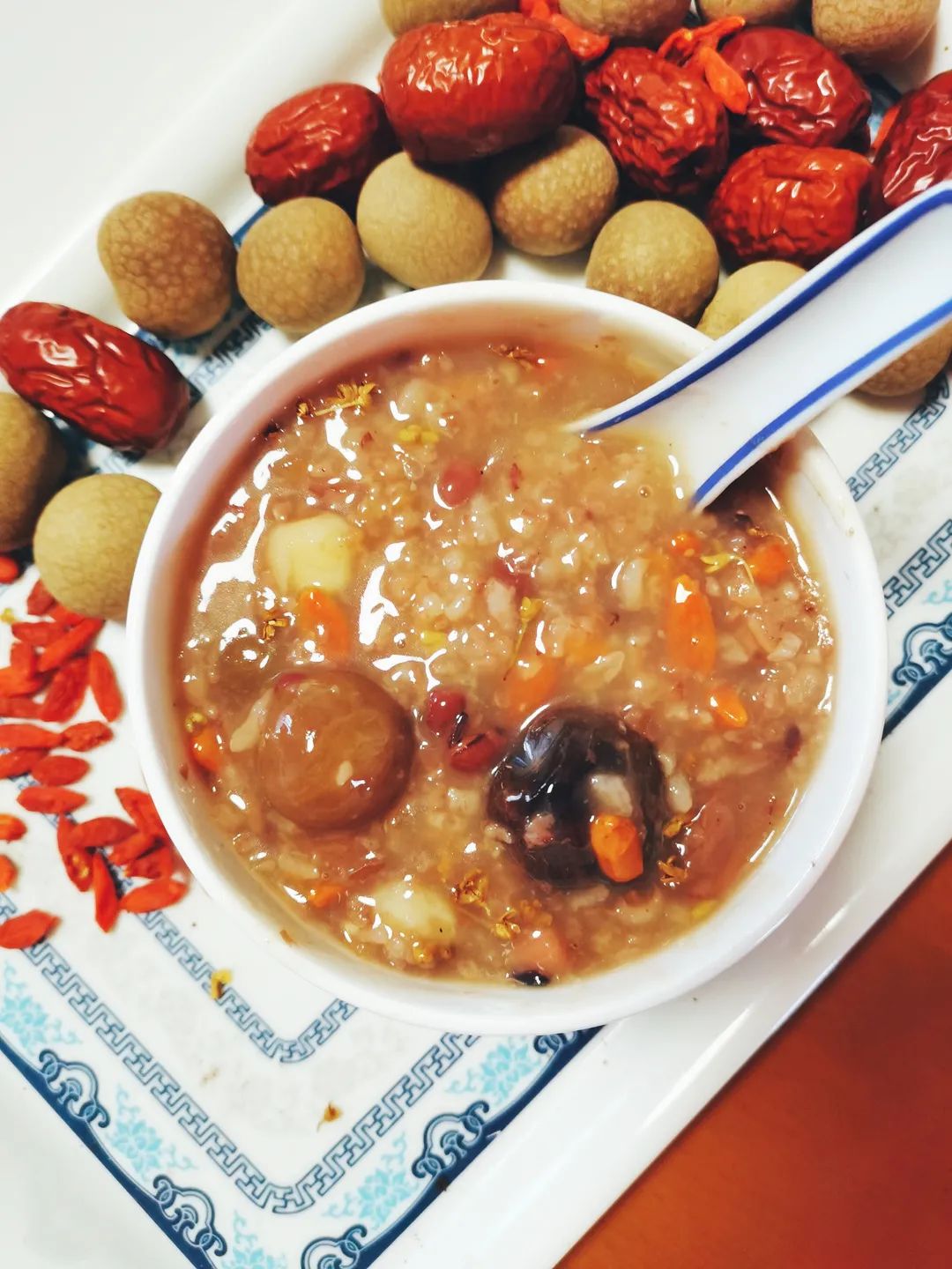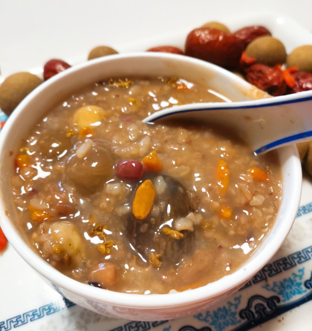 一般会加胡桃仁、松子仁、芡实、莲子、红枣、桂圆肉、荔枝肉等,香甜味美。