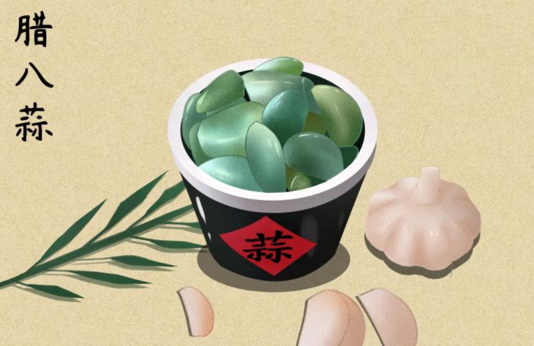 在北京、华北大部分地区有在腊八泡制腊八蒜的习俗。腊八蒜即是用醋泡的蒜,选用紫皮蒜和米醋,把蒜瓣的老皮去掉,浸入米醋中,装入小坛封上口放到一个冷的地方,直到蒜变成绿色方可食用。