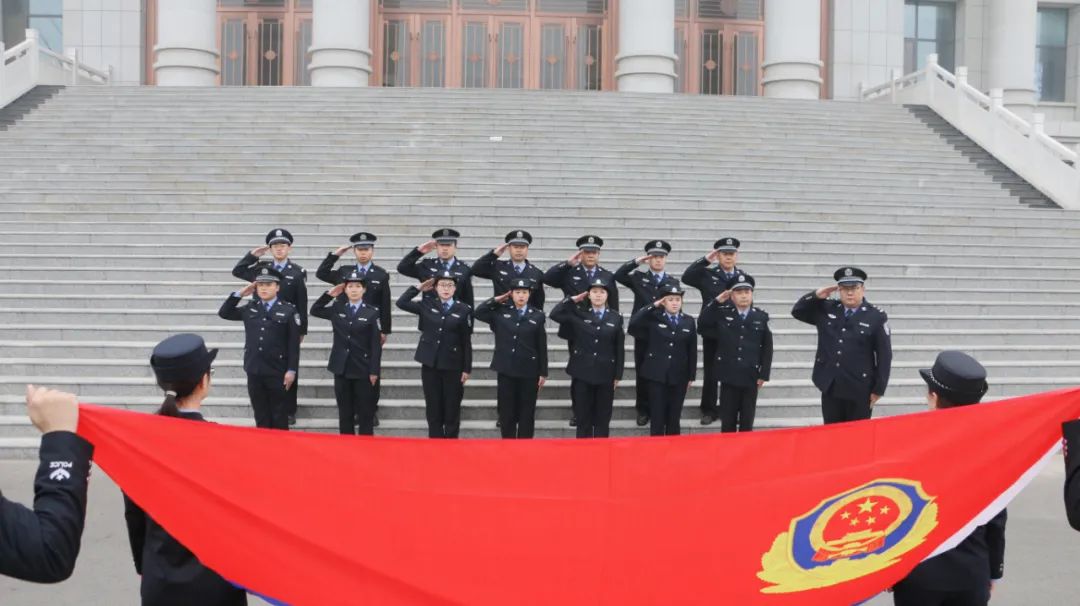 十九名司法警察在大队长徐利剑的带领下,整齐列队,举起右手,面向警旗庄重宣誓。法警们个个激情饱满,誓词铿锵有力。