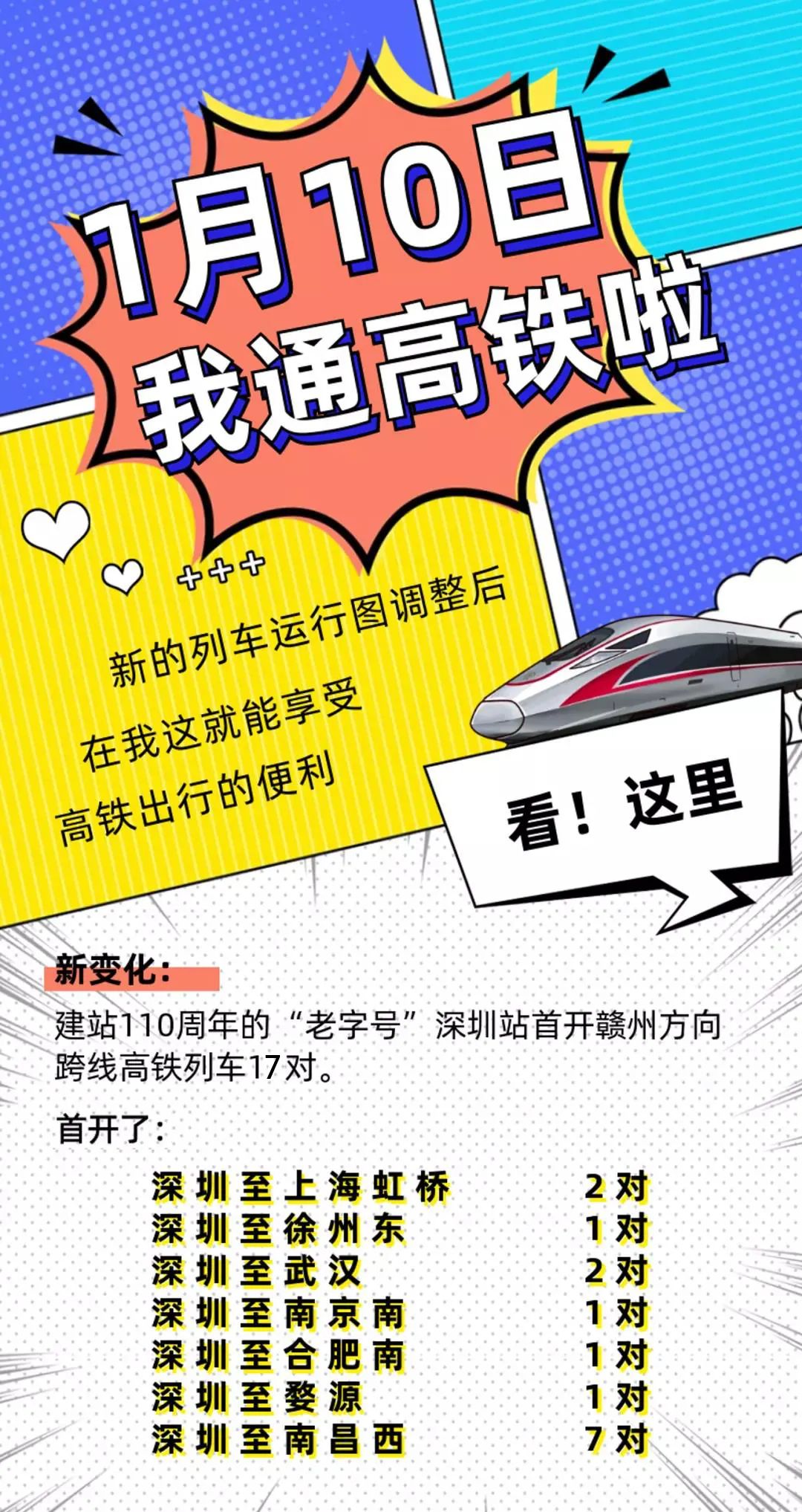 调图后,深圳北至南昌西经赣深线最快3小时30分可达,较既有经沪昆、京广高铁快1小时08分。深圳北经赣深线至合肥南,最快6小时48分可达,较既有经合福高铁、杭深高铁快2小时15分。上海虹桥经沪昆、昌赣、赣深高线至深圳,最快6小时50分可达,较既有经沪昆、京广高铁快1小时14分。