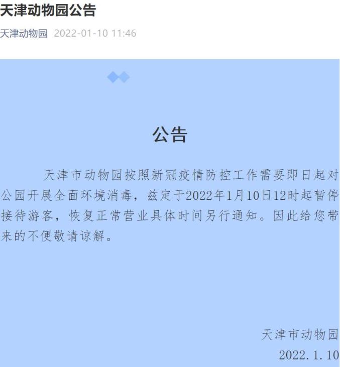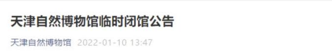 1月10日,天津动物园、天津图书馆、天津市群艺馆、天津自然博物馆等场所,相继发布公告:为避免人员聚集引发交叉感染,配合做好全市核酸检测大筛查,暂停对外开放,并暂停线下一切活动。