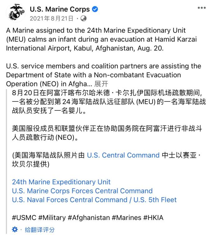 “美国海军陆战队员于混乱中救助阿富汗婴儿”,这“感人”的一幕在美国社交网络上广泛传播,美国海军陆战队更顺势在社交媒体上发布了一组图,展示美国海军陆战队第24远征队在紧急撤离阿富汗时的“铁汉柔情”,“体贴”地照顾着机场的幼童。