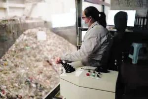 ▲工作人员操纵行车抓取垃圾。记者孙潇摄