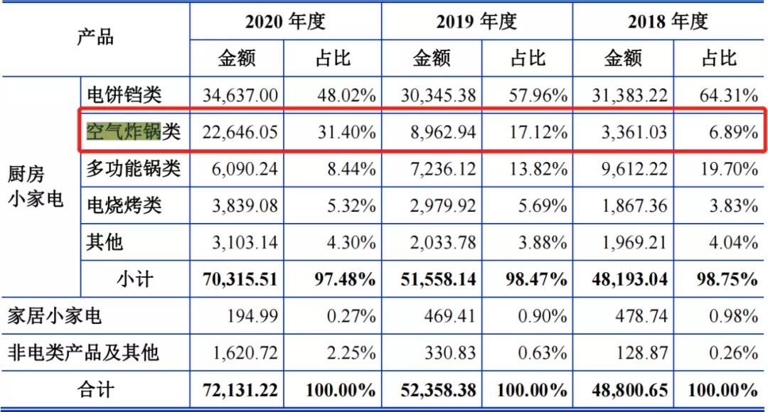 利仁科技原本以电饼铛为核心产品,随着电饼铛市场竞争加剧、增长空间见顶,电饼铛业务增长陷入瓶颈。而空气炸锅则为利仁提供了第二增长点。2021年6月的利仁科技招股书披露,空气炸锅类产品在利仁总营收中的占比,从2018年的6.89%提升到2020年的31.4%。