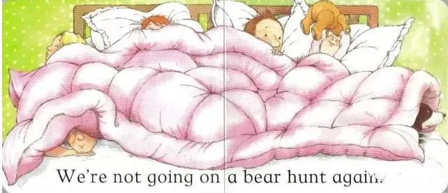 当一家人穿山越岭,费尽九牛二虎之力终于见到熊,才发现以他们的体格,赤手空拳地猎熊是不可能完成的任务。一家人急忙又一次,穿山越岭逃回家,最后跑进卧室,躲进被窝,说了句“我们再也不去猎熊啦”。