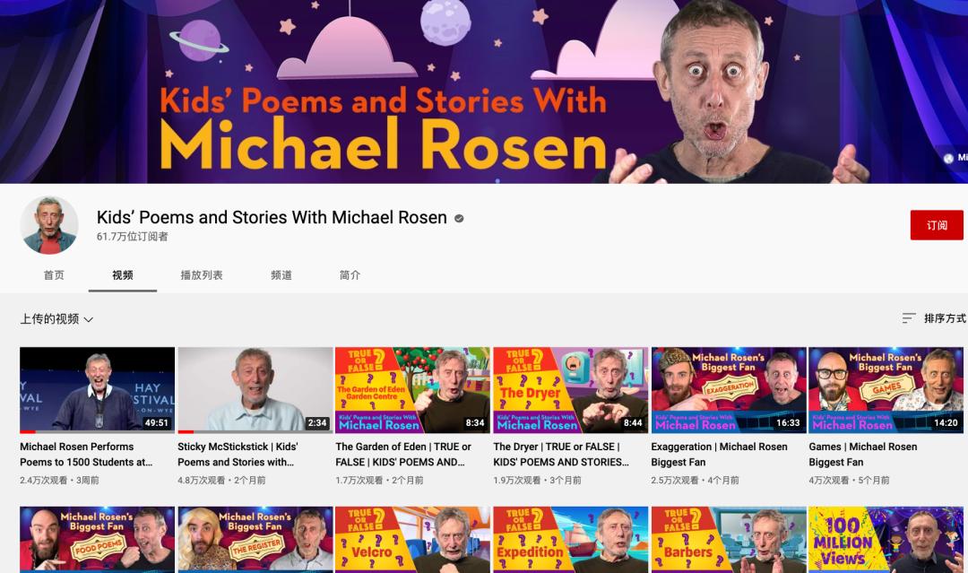 他在油管上有个叫“Kids’Poems and Stories With Michael Rosen(迈克尔·罗森和孩子们的诗歌与故事)”的频道,全部是他自己投稿的讲故事视频,其中最早的已经要追溯到14年前了。