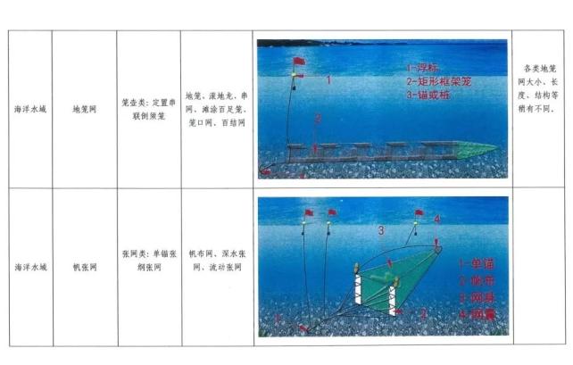 2、禁用渔具:除《中华人民共和国渔业法》及农业农村部规定的海洋禁用渔具以外,禁止使用双层刺网、三层刺网、底扒网、地笼网、帆张网以及其他破坏渔业资源的渔具。